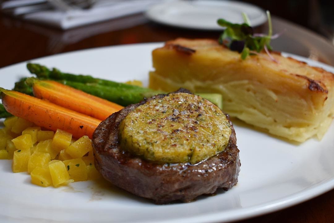 소고기 허릿살을 구운 스테이크에 버터 그라탱과 감자를 곁들인 디너 메뉴