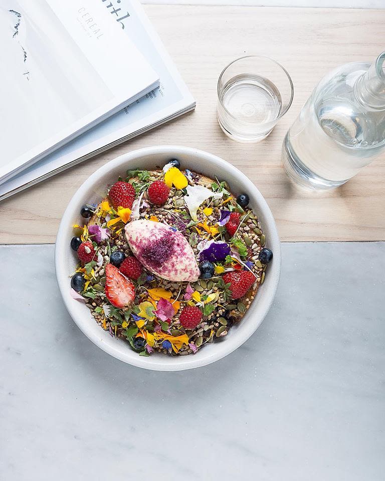 메이플 시럽, 제철과일 등을 올리고 꽃으로 장식한 핫케이크