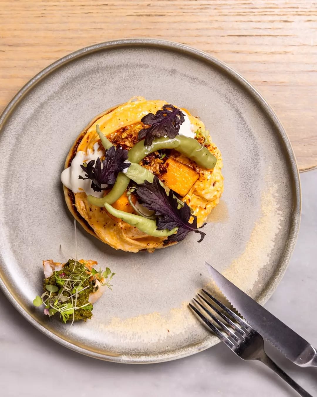 플랫 브레드에 스크램블드 에그와 고추 등을 올린 메뉴