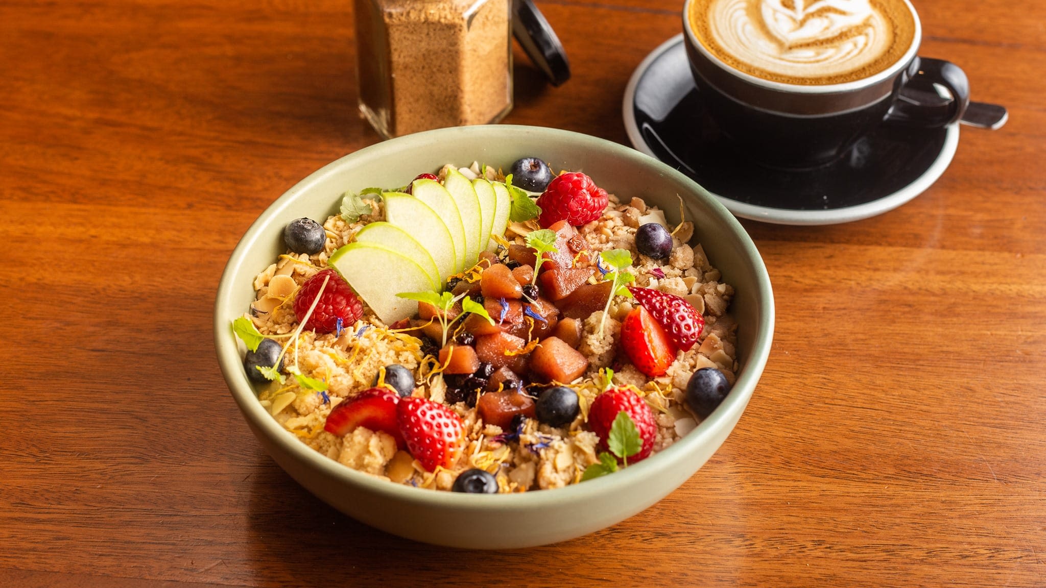 수제 뮤슬리에 신선한 과일과 오가닉 요거트를 넣은 메뉴
