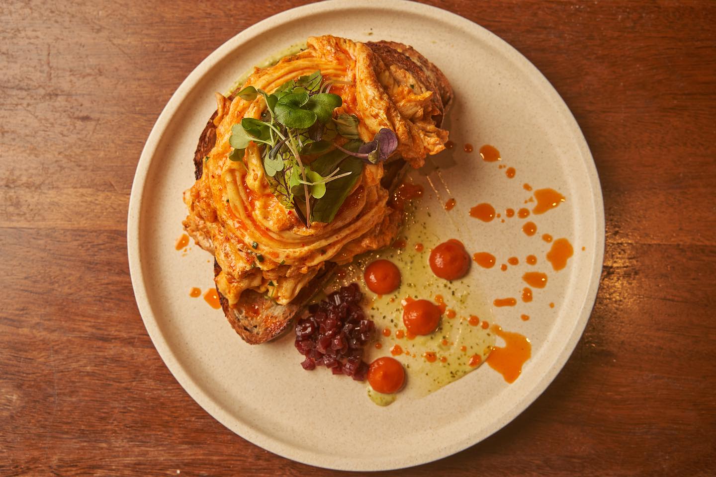 구운 빵 위에 스크램블 에그, 훈제 비트, 살사 소스 등을 올린 메뉴