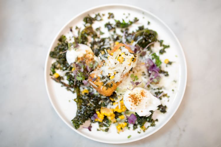 수란과 옥수수 퓨레, 바삭한 케일 등이 들어간 메뉴