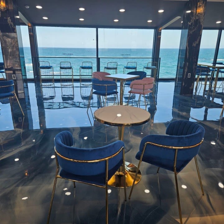 바다 위를 걷는듯한 바닥 인테리어가 시선을 사로잡는 오션 뷰 카페