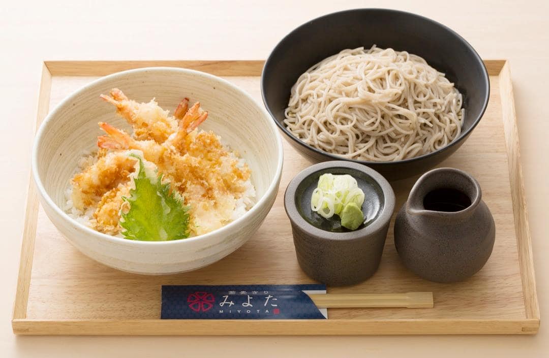 새우튀김 덮밥과 소바로 구성된 세트 메뉴
