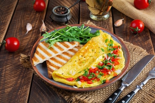 햄과 시금치를 곁들인 오믈렛과 빵, 버터, 에스프레소 등으로 구성된 메뉴