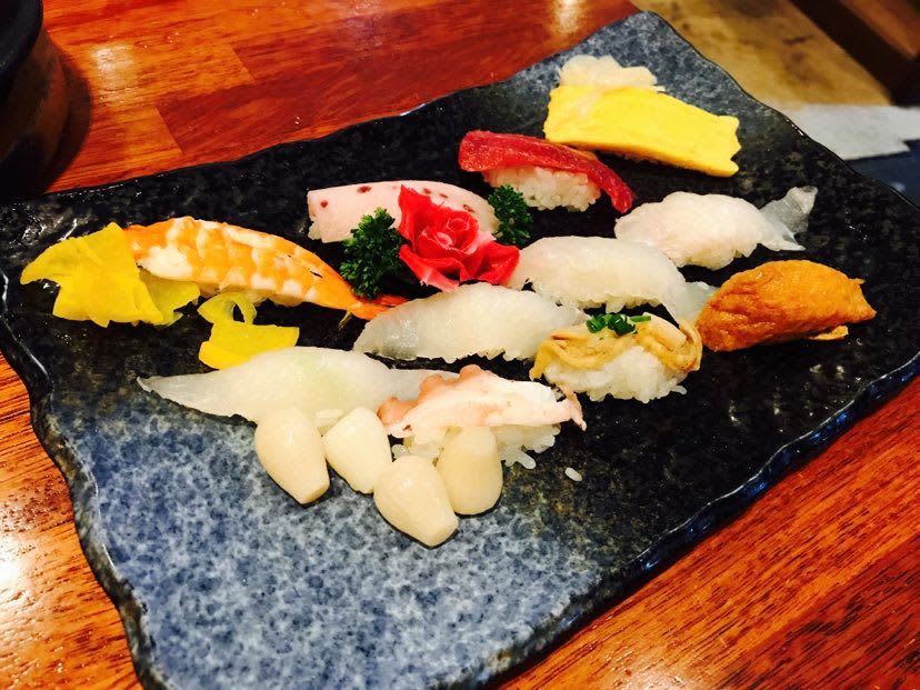 활어, 연어, 참치, 장어, 전복, 소라, 새우 초밥으로 구성된 세트 메뉴