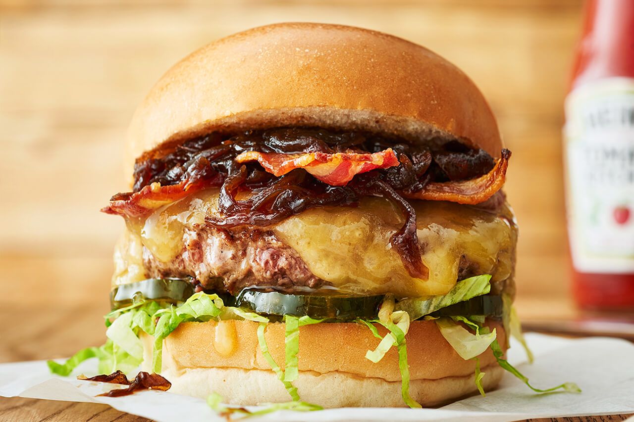 소고기 패티, 훈제 베이컨, 체더 치즈, 양상추, 피클 등을 넣은 햄버거