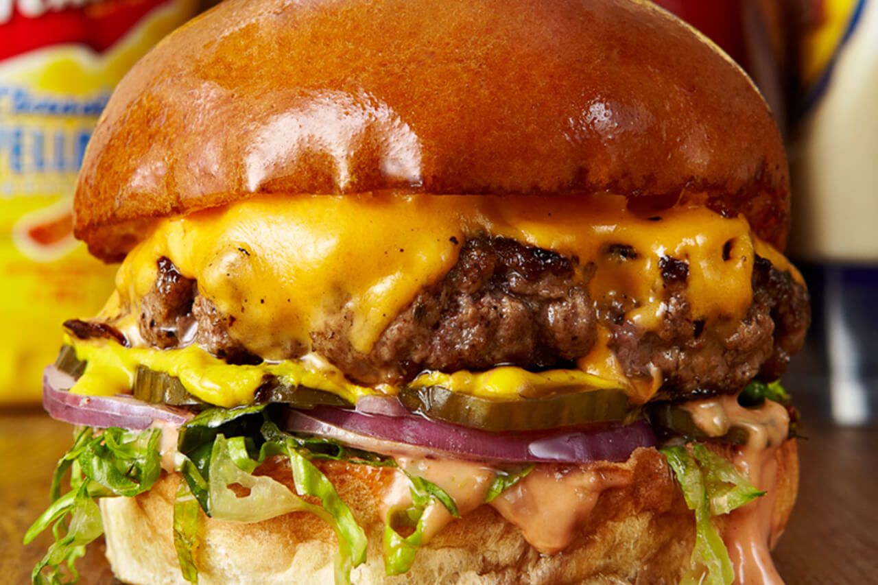 소고기 패티, 아메리칸 치즈, 브라운 버터 머스터드 마요네즈, 피클 등을 넣은 햄버거