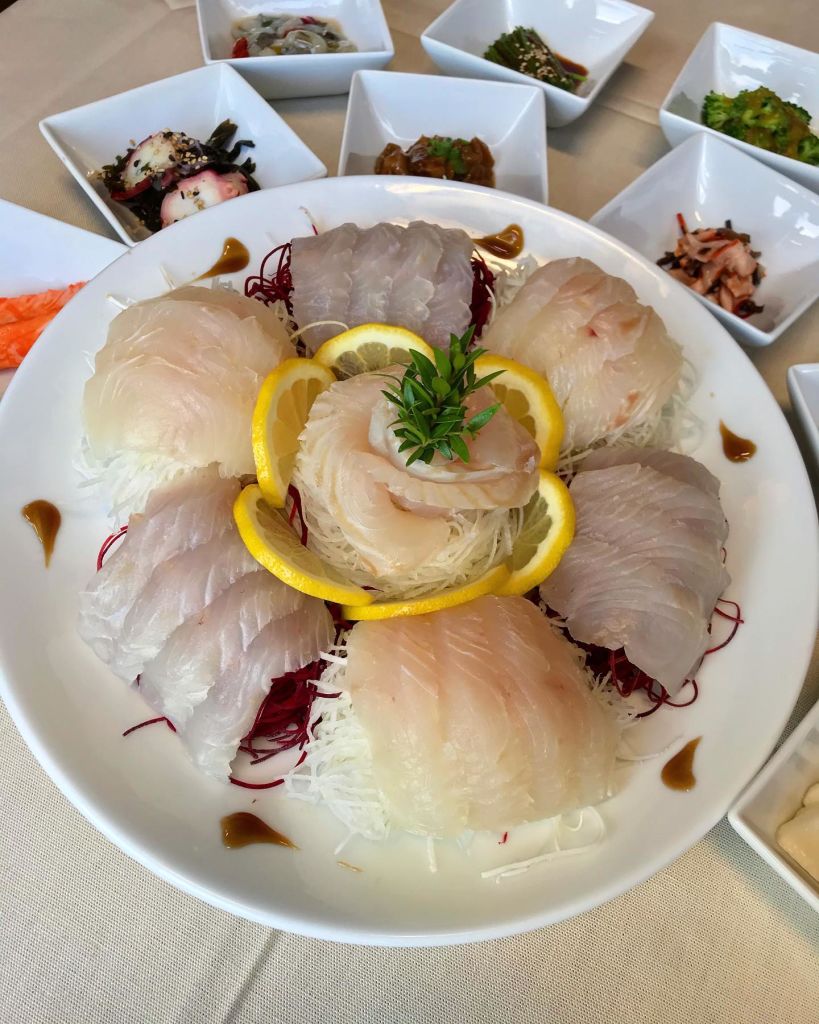 한국식 생선회와 푸짐한 밑반찬 한 상을 차려주는 횟집