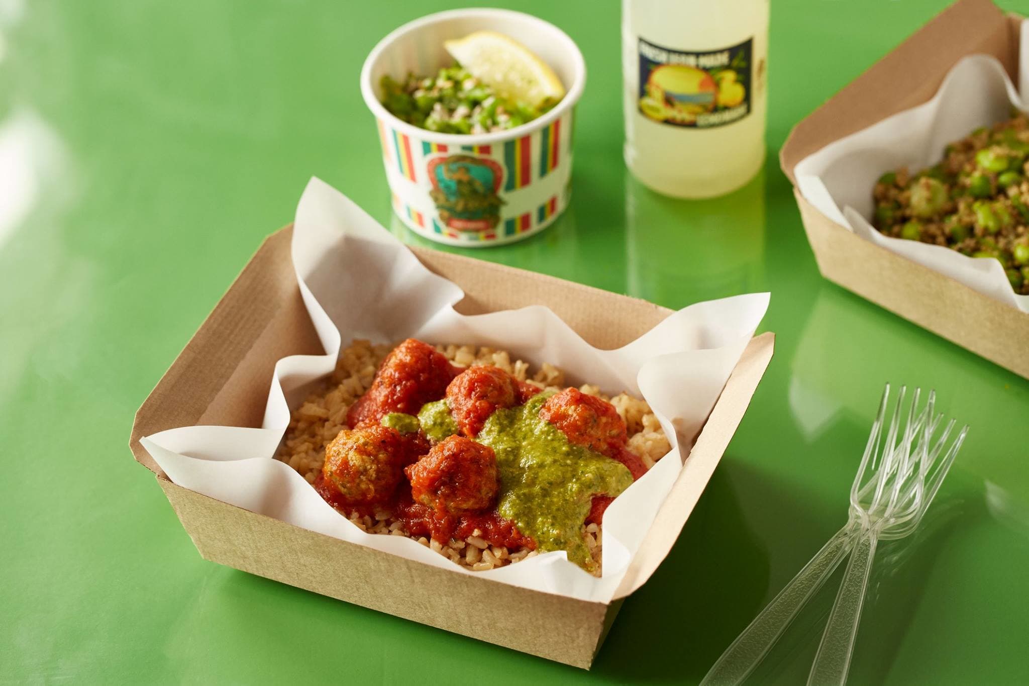토마토 소스를 곁들여 구워낸 미트볼, 파슬리, 마늘, 브라운 라이스를 박스에 담아낸 메뉴