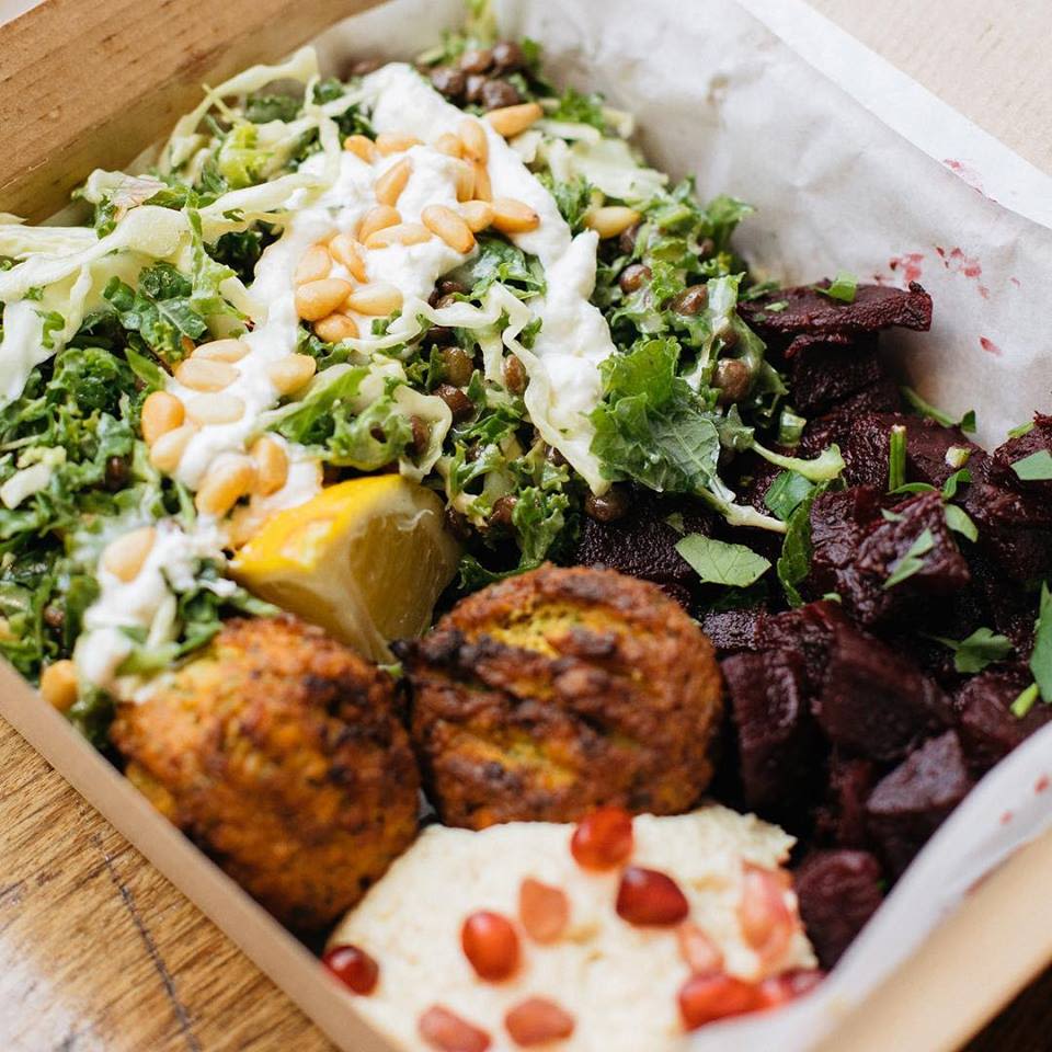 고구마 팔라펠과 구운 채소, 후무스, 샐러드, 브라운 라이스를 박스에 담아낸 메뉴