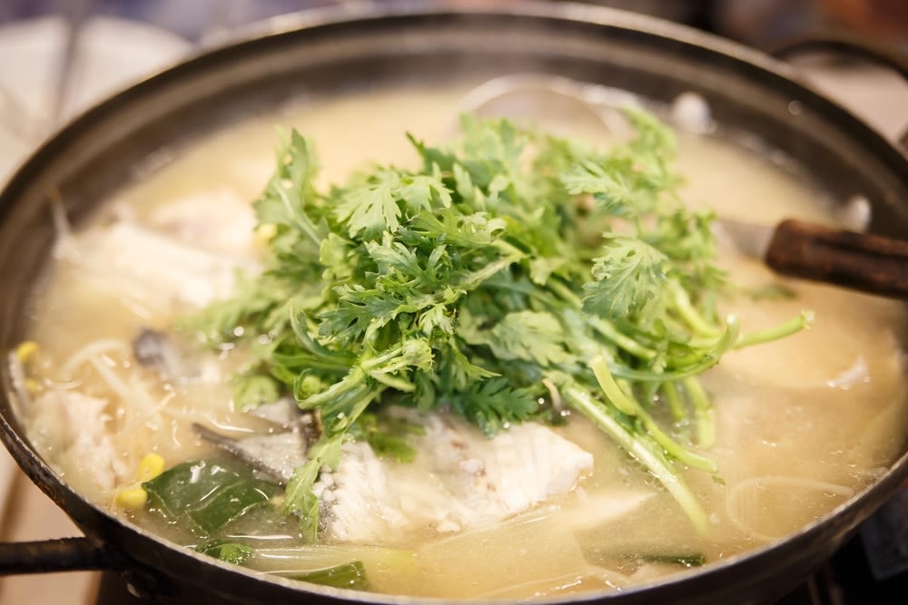 부드러운 식감의 흰 살 생선 '물곰'과 각종 채소를 넣어 시원하게 끓여낸 메뉴