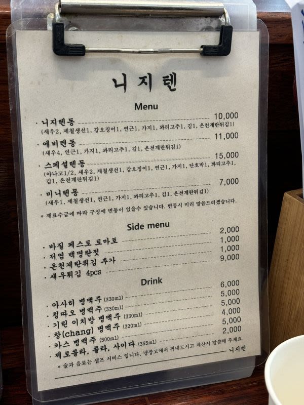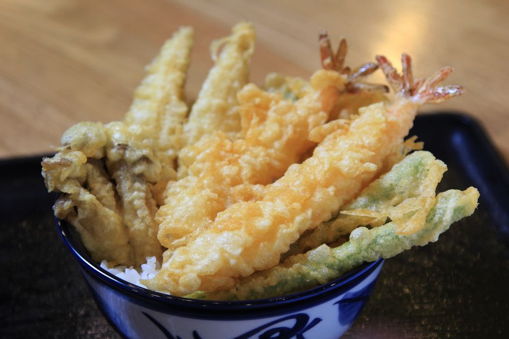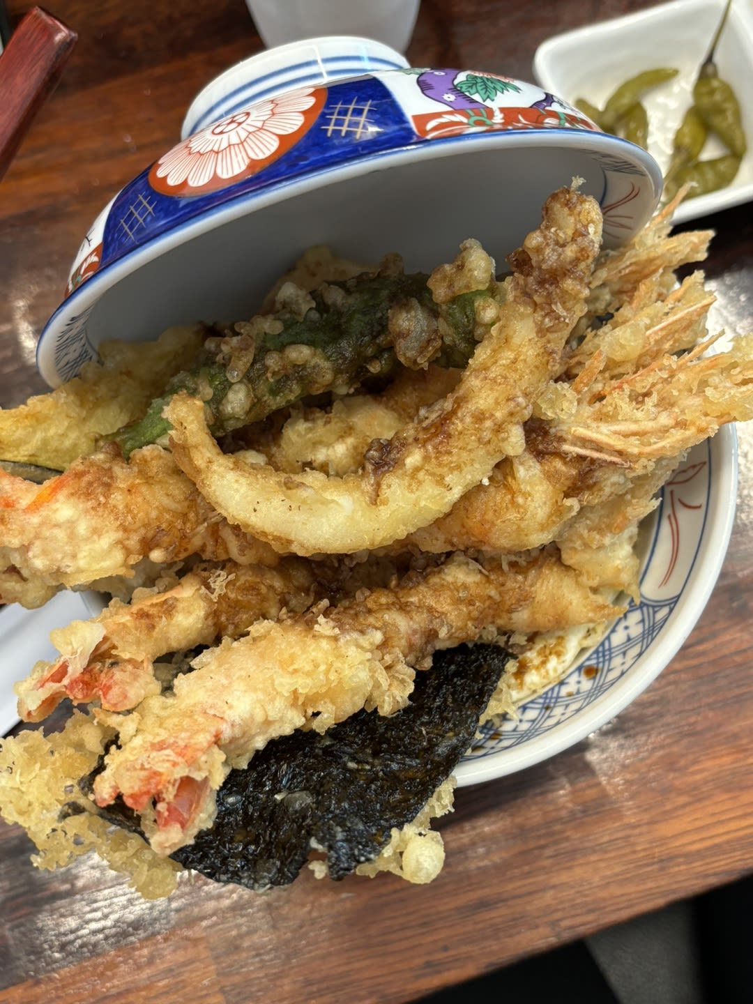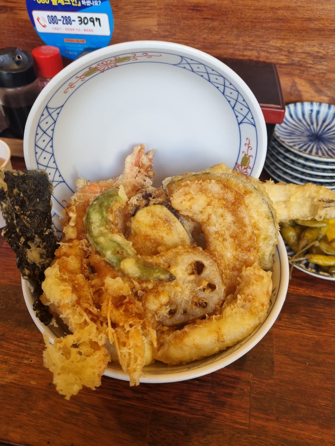 새우 4개, 연근 1개, 가지 1개, 꽈리고추 1개, 김 1개, 온천달걀튀김 1개로 구성된 메뉴