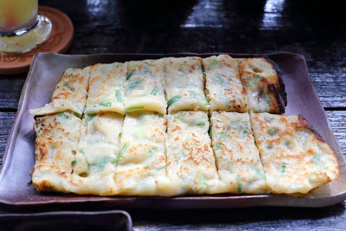 밀가루 반죽에 부추를 넣고 팬에 구운 메뉴