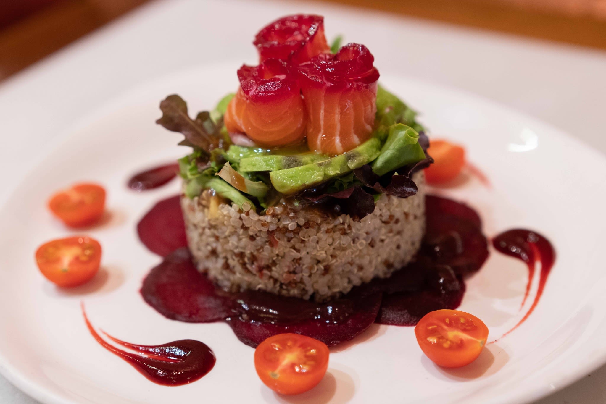 퀴노아에 각종 채소와 아보카도, 연어를 올리고 무화과 소스를 곁들인 메뉴