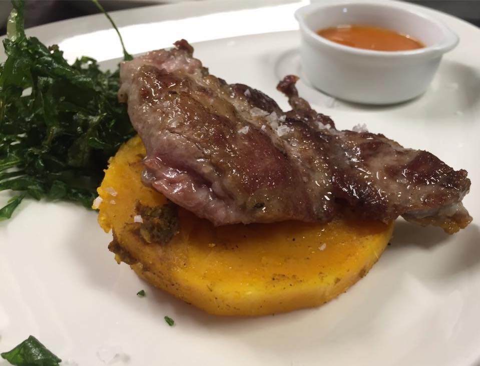 이베리코 돼지고기 스테이크에 구운 단호박과 커리 소스를 곁들인 메뉴