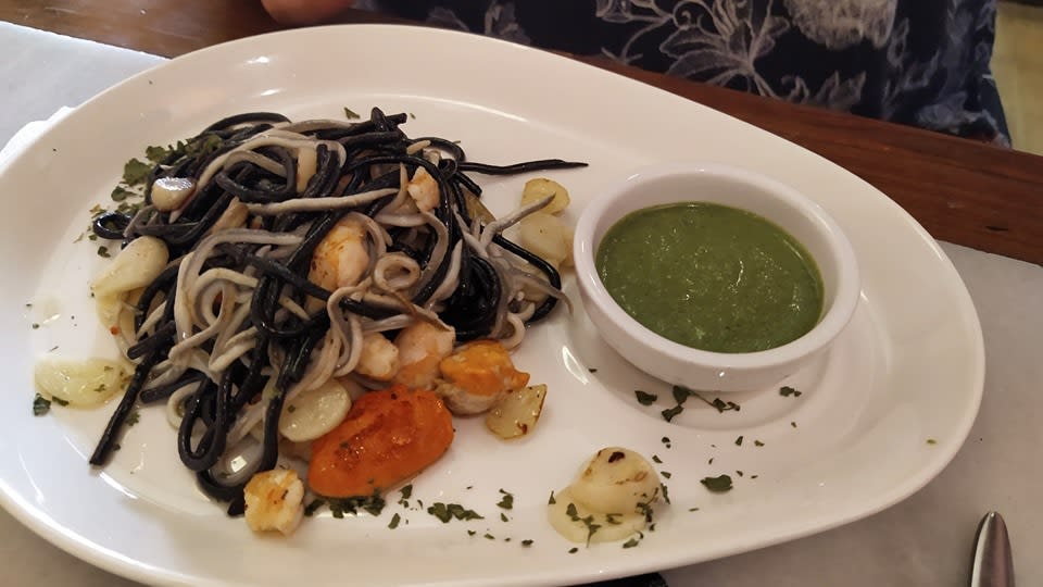 오징어 먹물로 반죽한 스파게티 면과 마늘, 페스토, 해산물을 넣고 볶아낸 메뉴