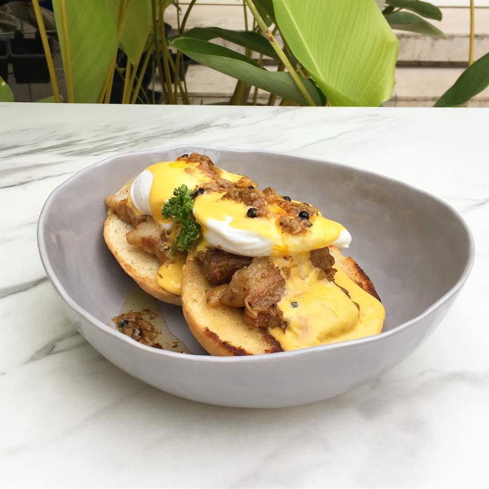 잉글리시 머핀 위에 돼지고기 조림인 '아도보'와 수란을 올리고 홀랜다이즈 소스를 뿌린 요리