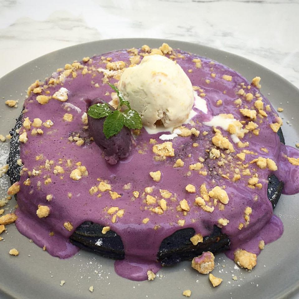 팬케이크 위에 보라색 참마를 넣고 만든 크림, 시리얼, 우유 아이스크림을 얹은 메뉴