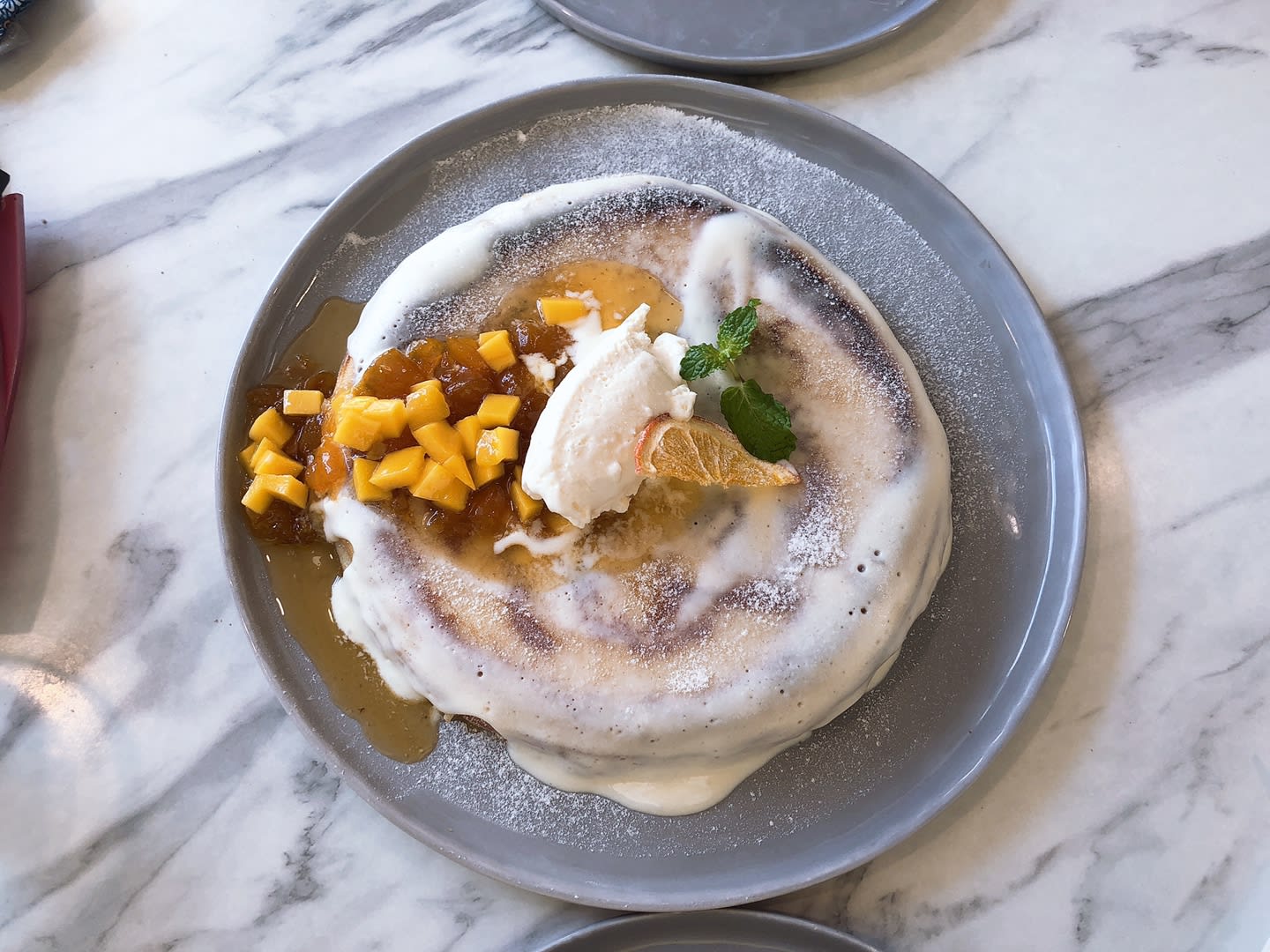 팬케이크 위에 망고를 섞은 생크림과 크림치즈를 얹은 메뉴