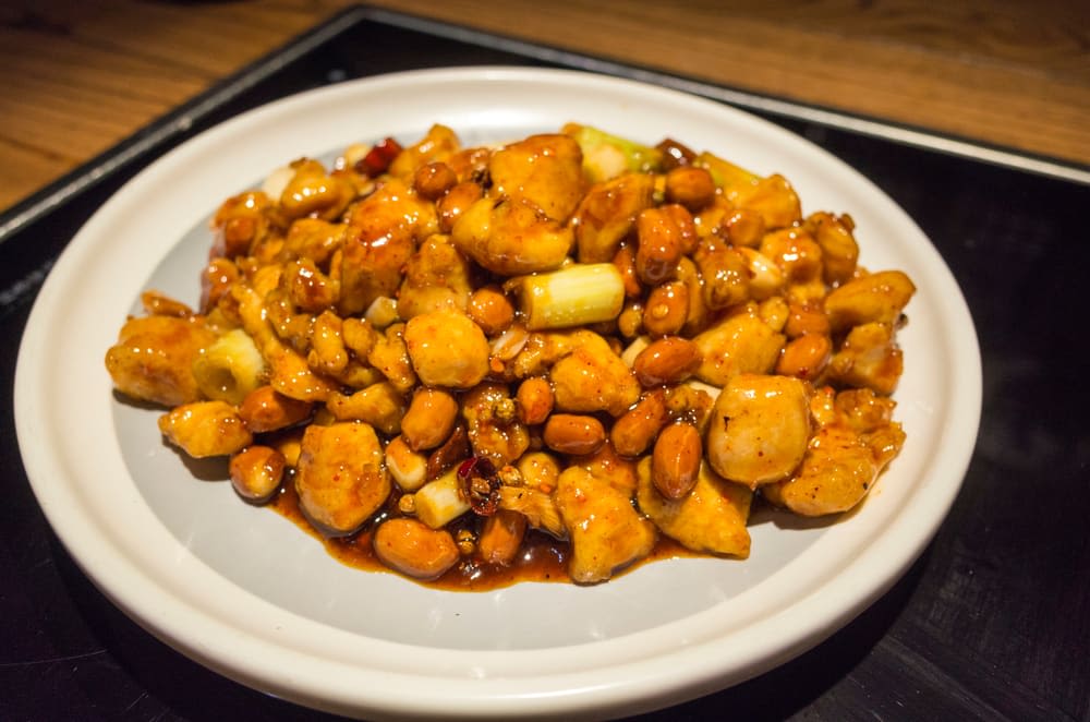 닭고기와 땅콩, 고추, 양파, 매콤한 양념을 함께 볶아낸 메뉴