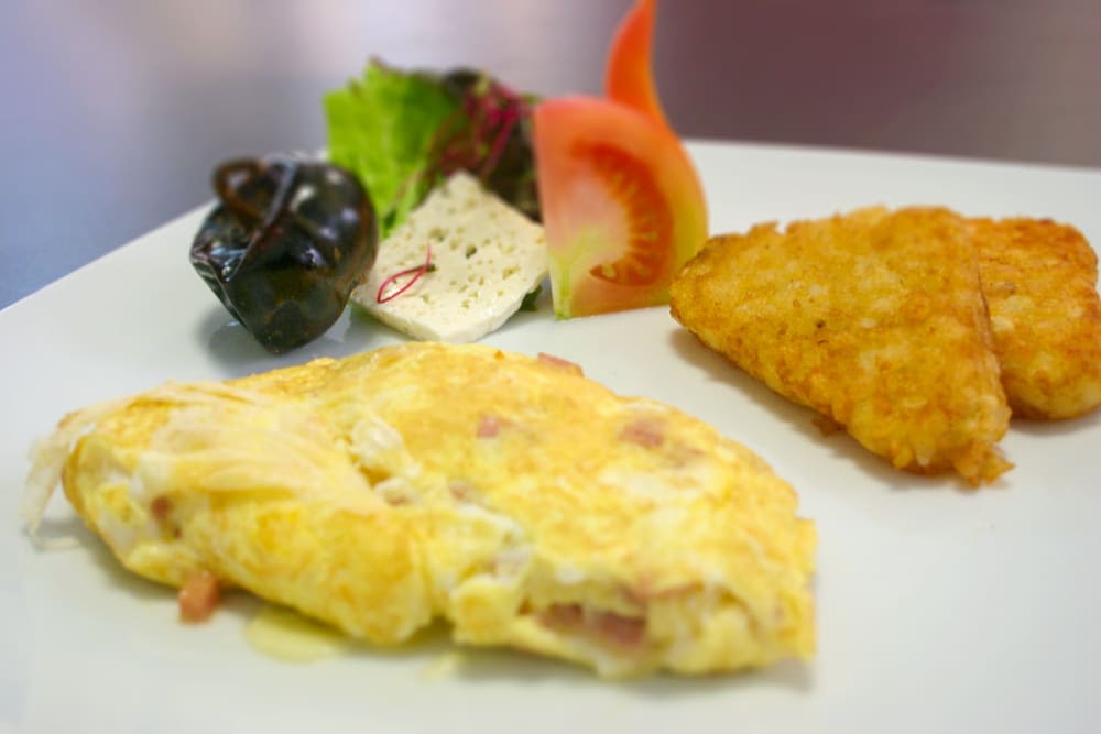 햄, 치즈, 양파를 넣은 오믈렛에 감자를 잘게 썰어 만든 해시브라운을 곁들인 메뉴