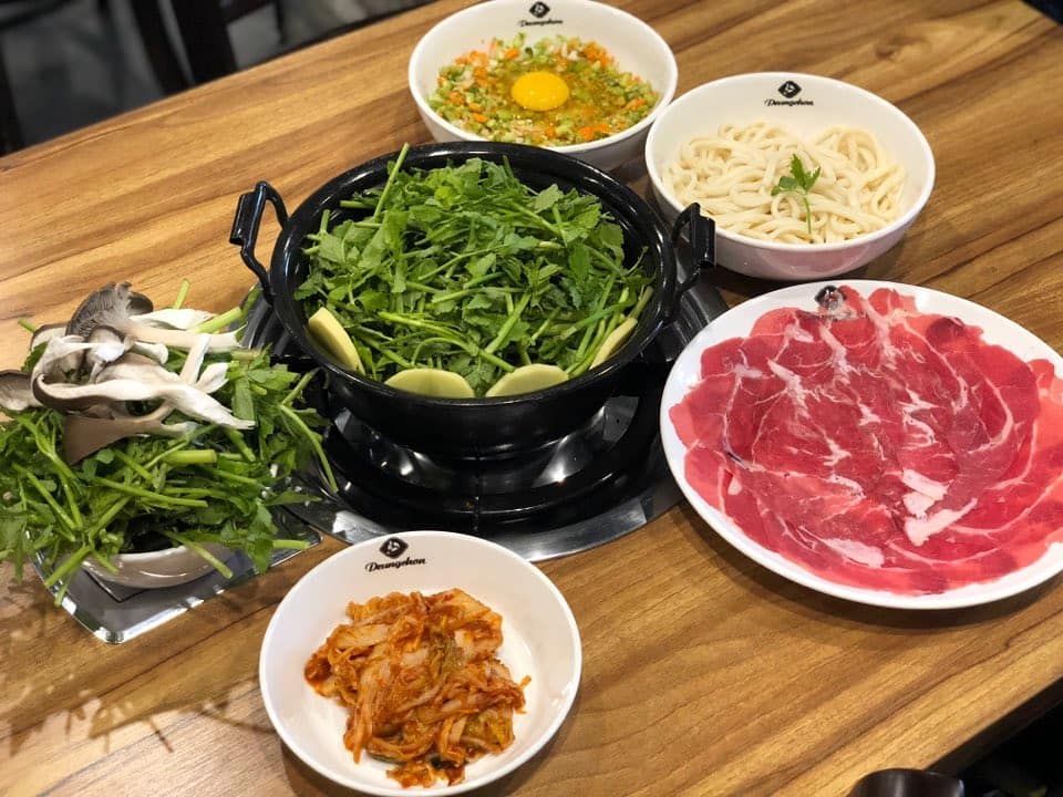 버섯과 미나리를 듬뿍 넣은 얼큰한 샤부샤부 칼국수로 유명한 음식점