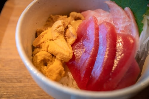 새우, 참치, 성게알 등을 얹은 해산물 덮밥 메뉴