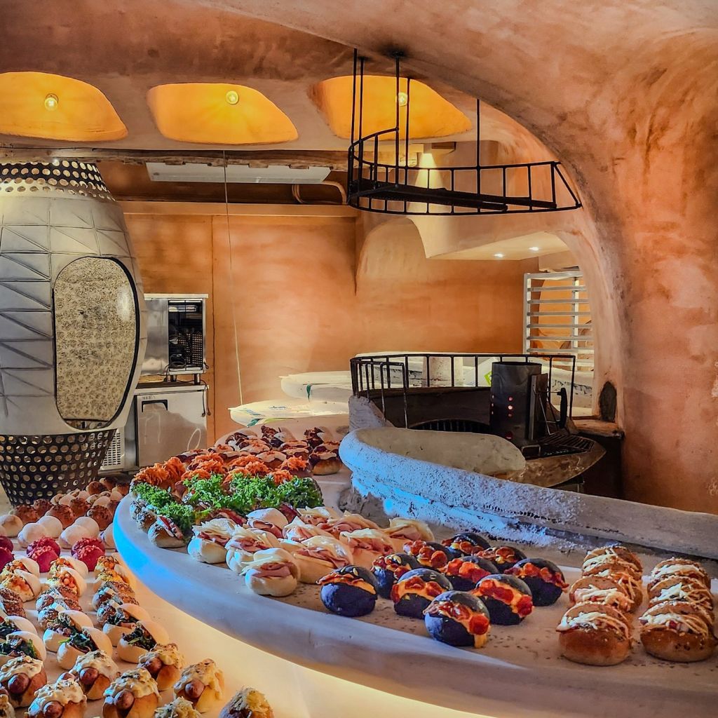황토빛 동굴 같은 인테리어가 시선을 사로잡는 대형 베이커리 카페