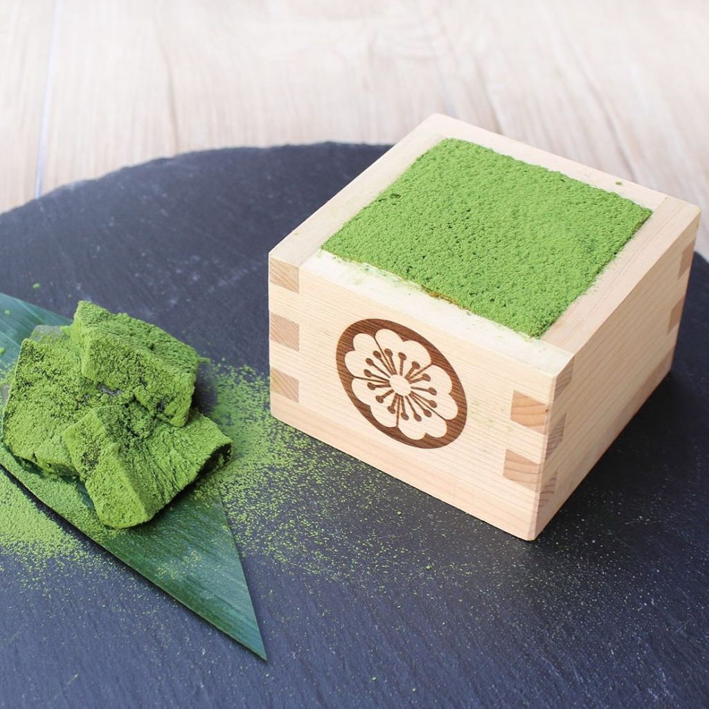 말차 스펀지 케이크와 크림치즈를 번갈아 쌓아올린 디저트
