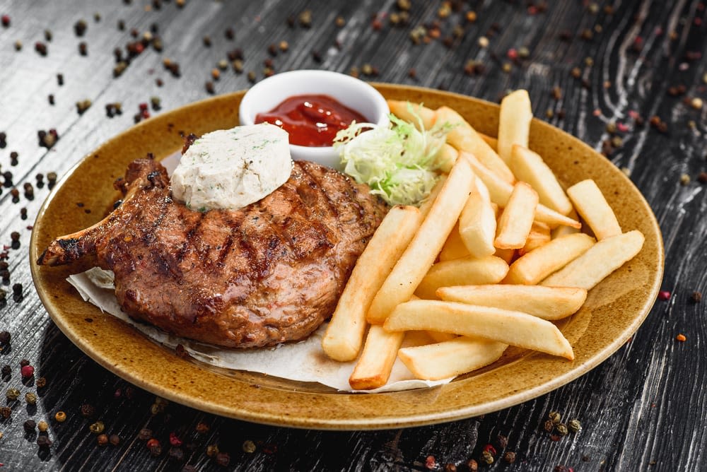 마늘과 함께 구워낸 소고기 스테이크에 감자튀김을 곁들인 메뉴