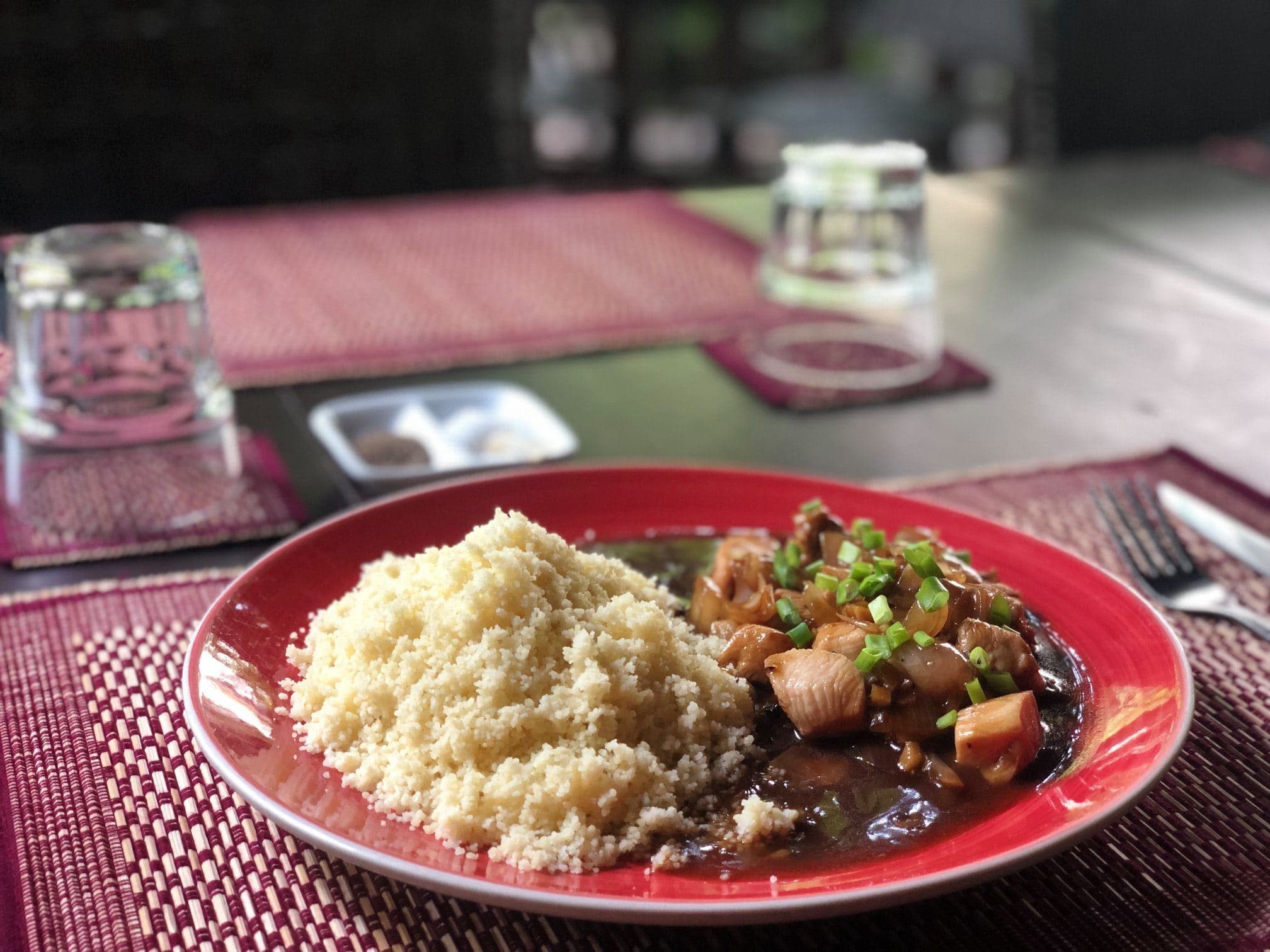 으깬 마카로니 밀을 쪄낸 후 닭고기 또는 소고기 미트볼을 곁들인 메뉴