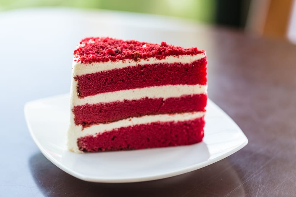 붉은 색을 낸 케이크 시트 사이에 크림치즈를 채워넣은 케이크