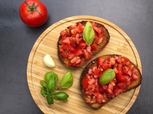 기름에 구운 바게트빵 위에 토마토와 바질을 올린 메뉴