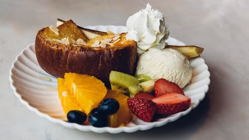 구운 토스트 위에 바닐라 아이스크림, 과일을 곁들인 메뉴 (14:00 - 19:00 주문 가능)