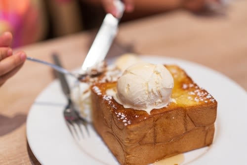 구운 토스트 위에 꿀과 바닐라 아이스크림을 올린 메뉴 (14:00 - 19:00 주문 가능)