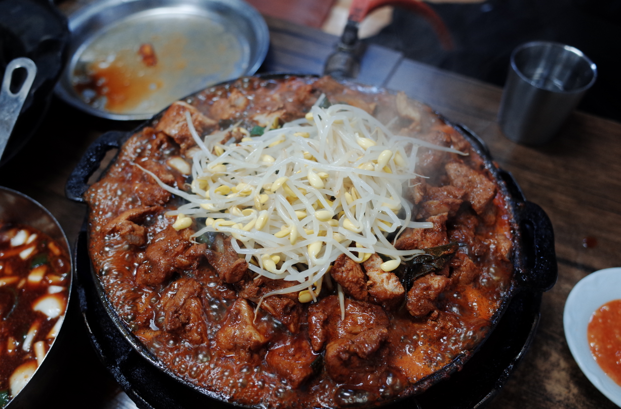 매콤 달달한 양념에 돼지고기와 콩나물을 끓인 물갈비 맛집