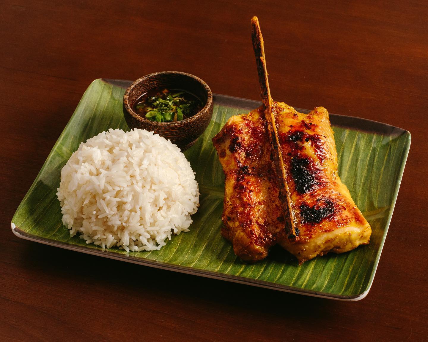 달걀 프라이를 얹은 밥과 닭다리 꼬치 등으로 구성된 점심 메뉴