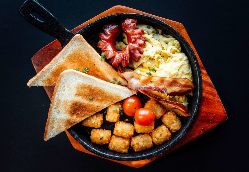 토스트에 베이컨, 스크램블 에그, 소시지, 해시 브라운을 곁들인 메뉴