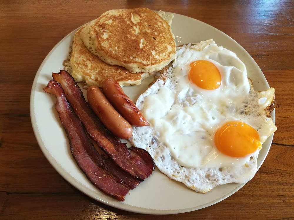 팬케이크에 달걀, 베이컨, 소시지를 곁들인 메뉴
