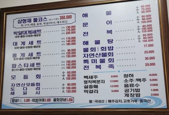 홍게, 물회, 모둠 회, 매운탕으로 구성된 메뉴