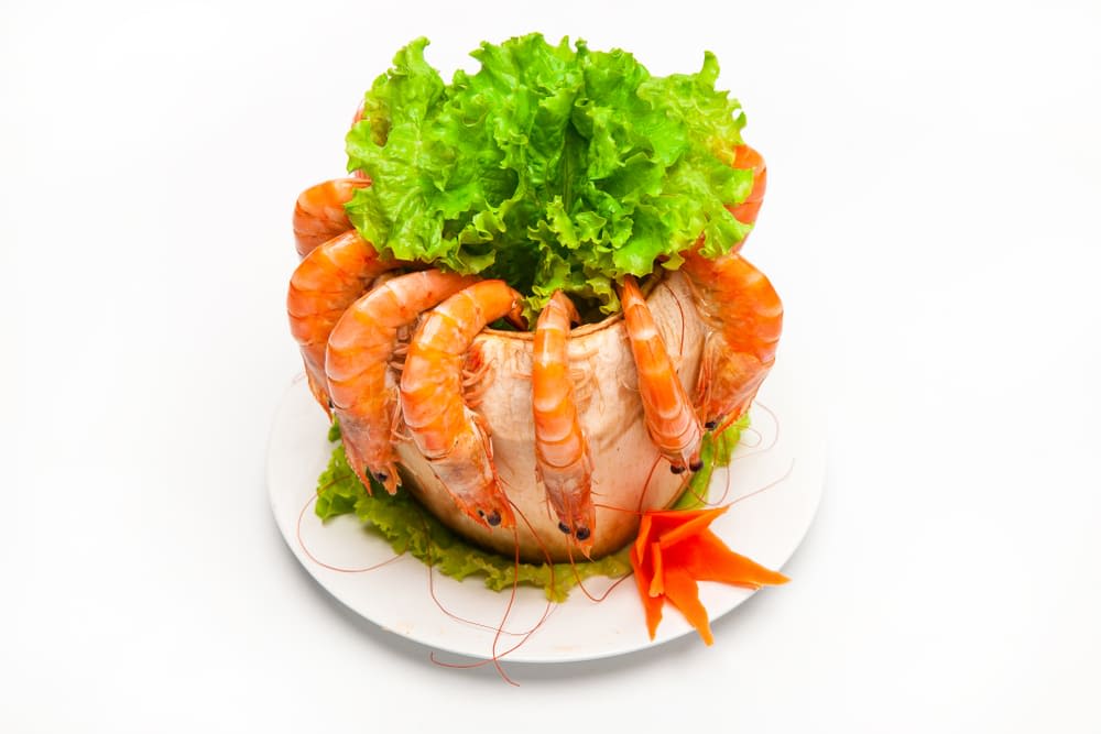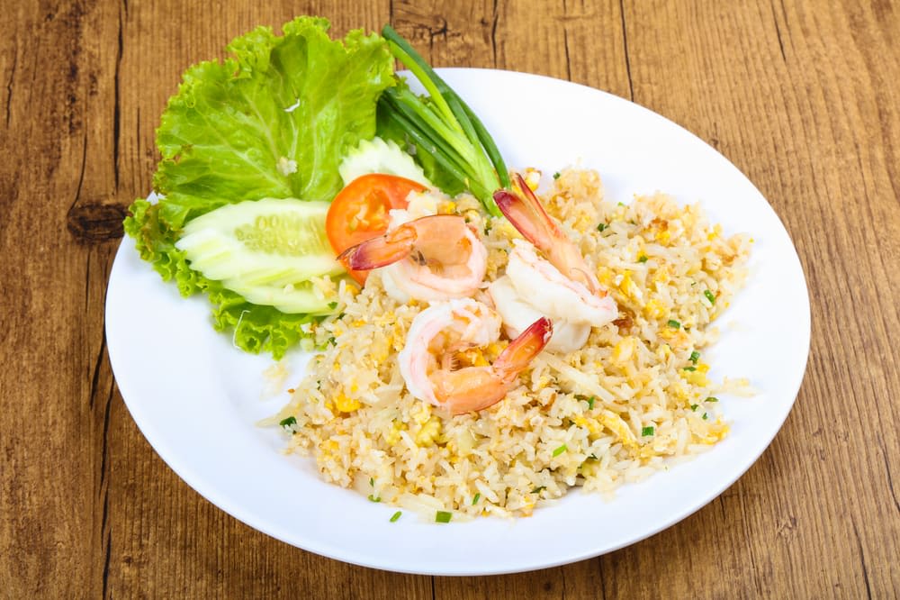 당근, 양파 등 각종 채소를 넣고 볶은 밥에 삶아서 손질한 새우를 곁들인 메뉴