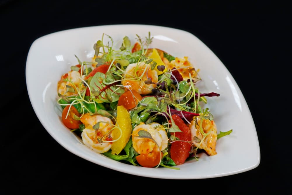 잘게 썬 파파야, 방울 토마토, 새싹 등 각종 채소와 새우, 망고, 돼지고기를 넣은 샐러드