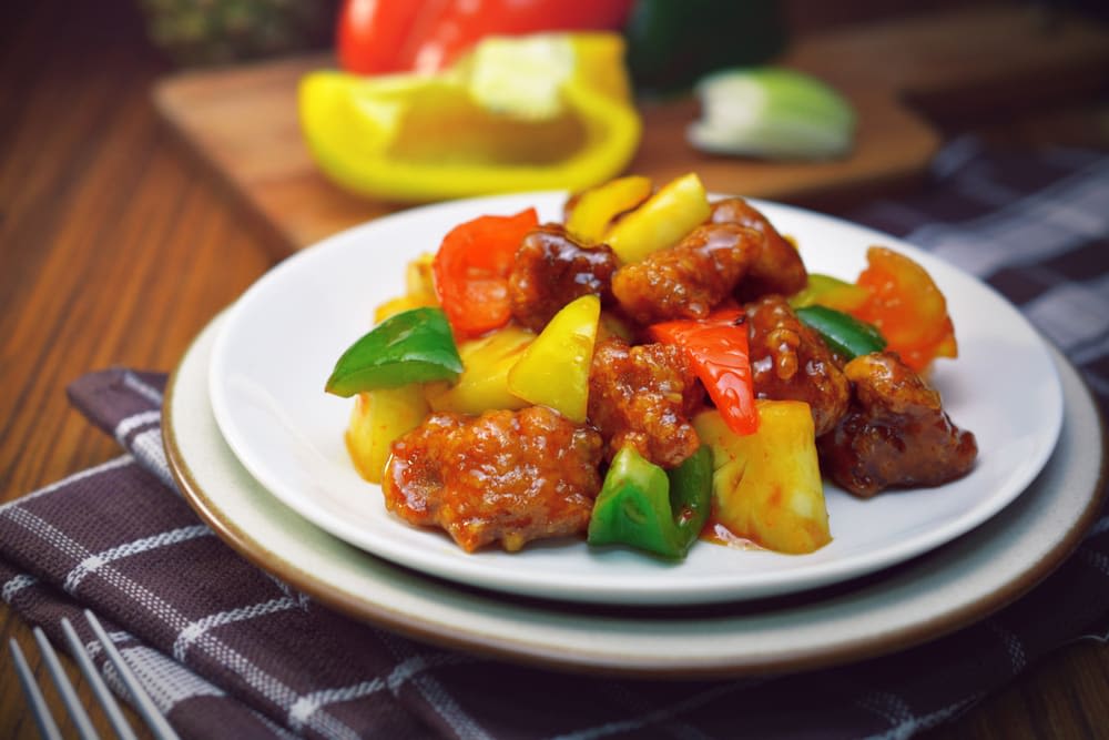 구운 돼지갈비와 양파, 파프리카 등 채소, 새콤달콤한 오렌지 소스를 넣고 볶아낸 메뉴