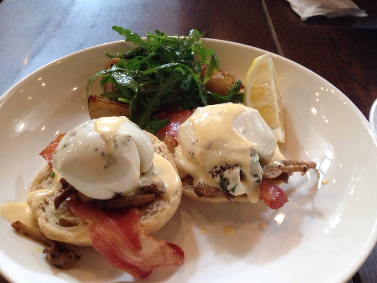 구운 잉글리시 머핀에 베이컨, 수란을 얹고 소스를 곁들여먹는 샌드위치