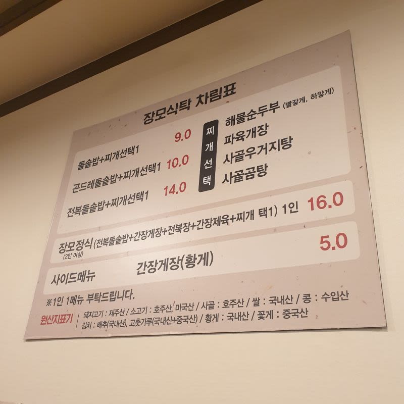 1인 1메뉴, 장모 정식 2인 이상 주문 필수