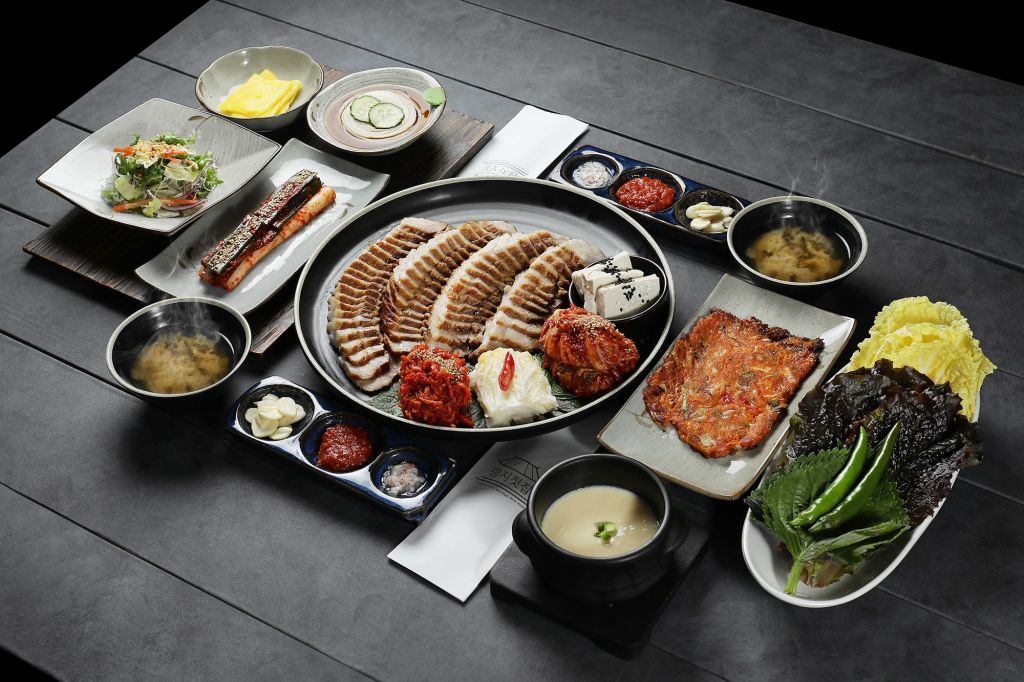보쌈 정식, 고등어구이, 젓갈 9종으로 구성된 세트 메뉴