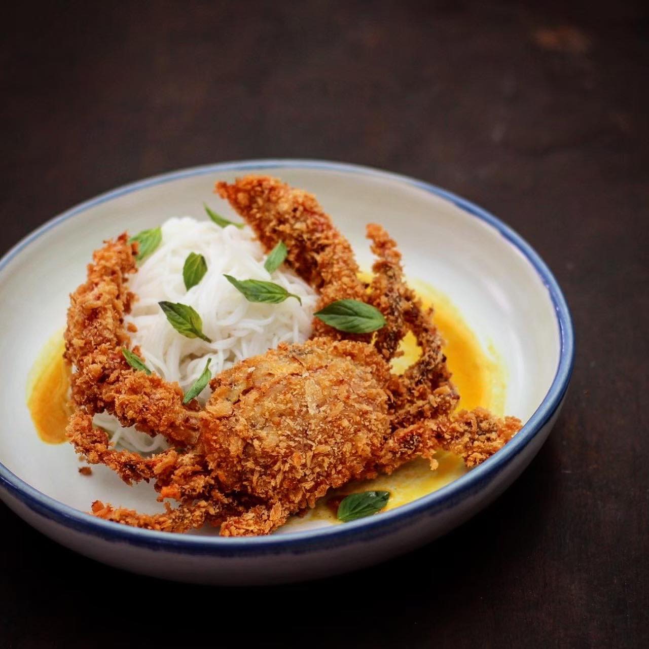 쌀국수 면에 통으로 튀긴 게, 커리 소스 등을 곁들인 메뉴