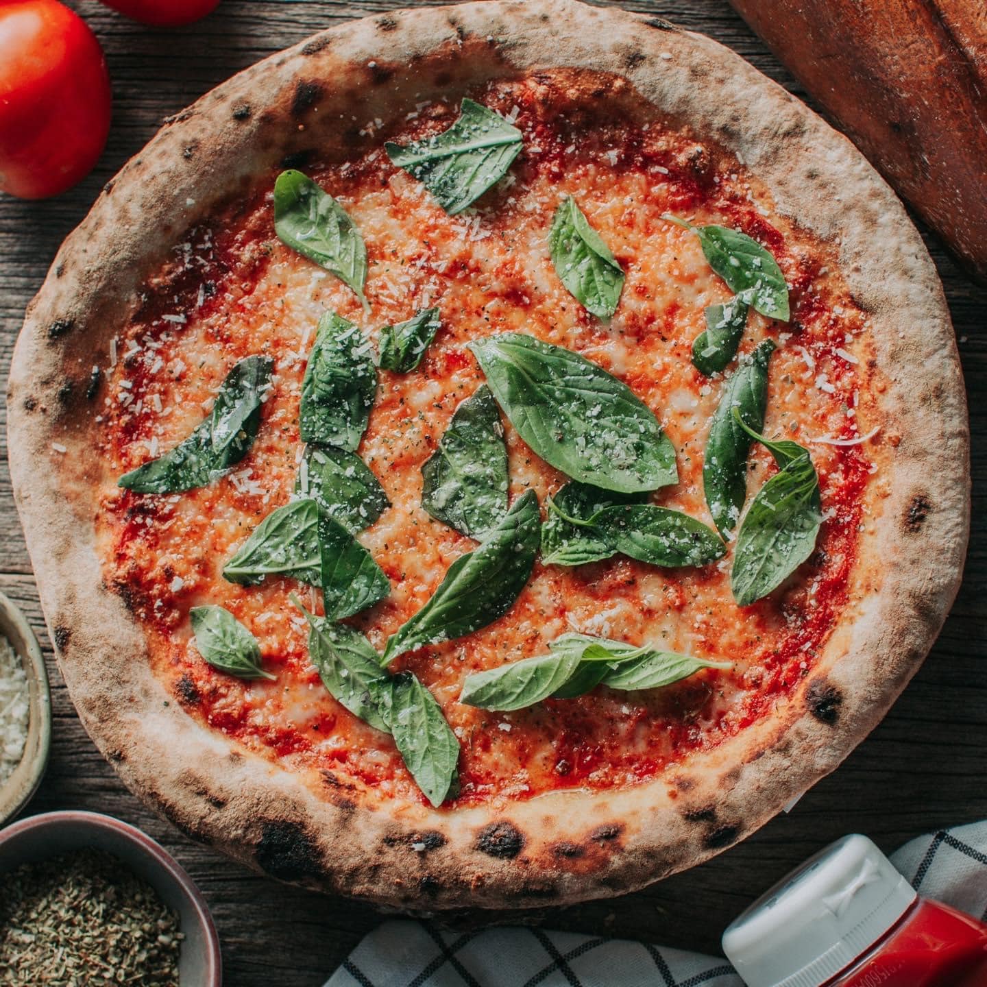 토마토 소스, 모차렐라 치즈, 바질을 토핑한 피자 메뉴