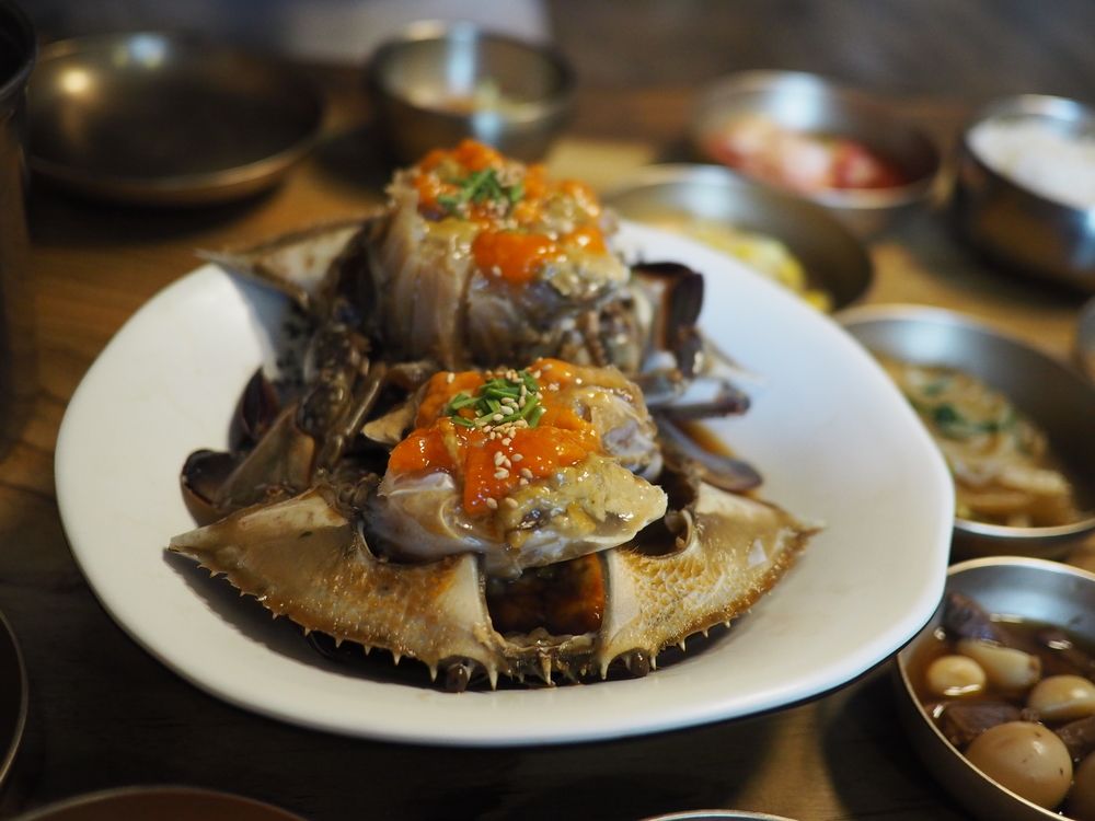속에 알이 꽉 찬 간장게장으로 구성된 정식 메뉴가 인기 있는 음식점